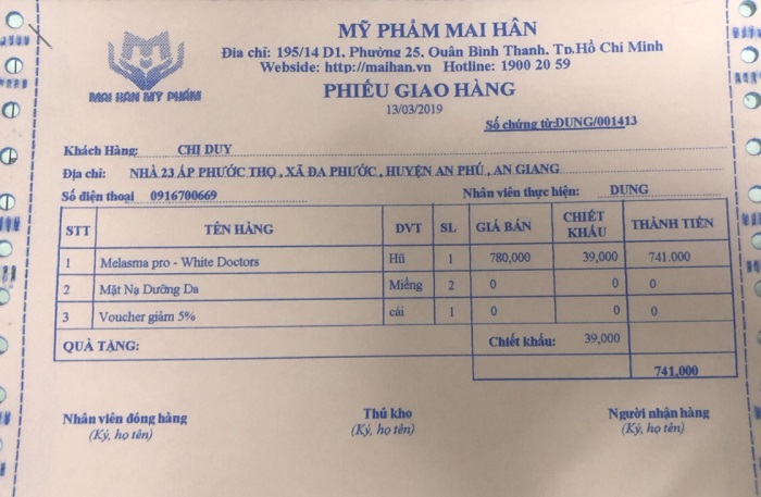 Website chính thức của Mỹ Phẩm Mai Hân là https://maihan.vn/, khi tiến hành giao dịch, khách hàng cần kiểm tra cẩn trọng con dấu của công ty chúng tôi – Công ty CP TM – SX - DV Mai Hân (Mỹ Phẩm Mai Hân) trên hóa đơn.