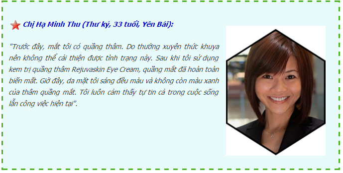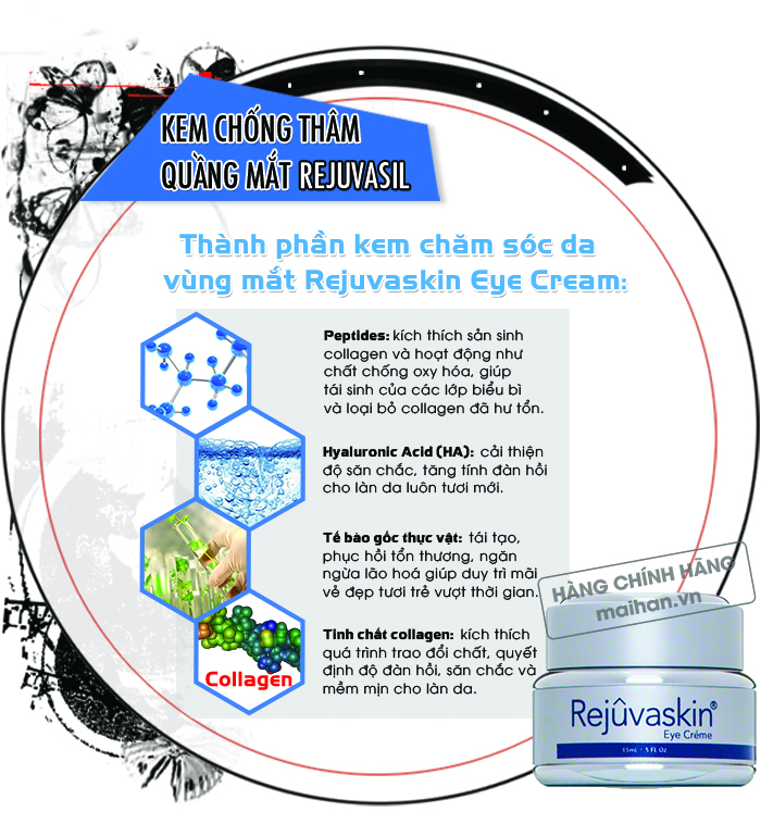 Rejuvaskin Eye Cream có chứa thành phần polipeptide là thế hệ kem chăm sóc da vùng mắt mới, có khả năng đột phá, không chỉ nổi bật về tác dụng chống thâm quầng, nhăn da và dưỡng da quanh vùng mắt mà còn có khả năng chữa trị các dấu hiệu lão hóa vùng mắt: làm mờ nếp nhăn trên trán, vết chân chim nơi khoé mắt, vết nám, đồi mồi và cải thiện làn da thô ráp lại tuyệt đối an toàn cho đôi mắt của bạn.