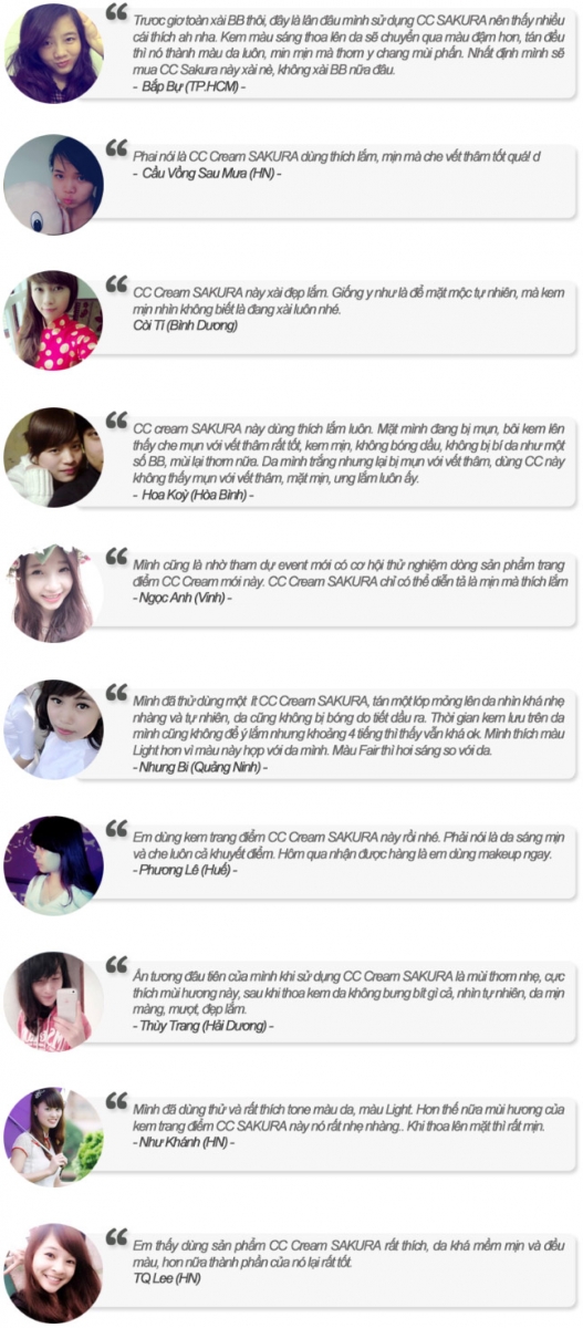 Tưng mới khám phá ra kem trang điểm đa năng Sakura CC Cream thật là tiện lợi. Tưng xài hôm giờ rồi thích quá nên muốn chia sẻ với mọi người ngay. Xài vừa dưỡng trắng da, vừa trang điểm và không sợ nắng luôn. Tưng dùng nhiều loại kem trang điểm rùi mà thích loại này. Xài cả ngày mà không thấm nước da trắng căng mịn luôn nè… Ah đặc biệt không bị mụn nha. Rất phù hợp với làn da Châu Á như Tưng. – Lê Thị Huyền Anh "