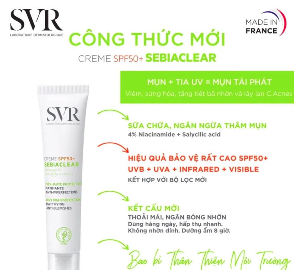 Lựa chọn hàng đầu cho các làn da dầu mụn chính là kem chống nắng ngăn ngừa mụn SVR Sebiaclear Creme SPF50, đến từ hãng dược mỹ phẩm nổi tiếng tại Pháp - SVR. Ứng dụng thành phần chống nắng ưu việt kết hợp cùng các dưỡng chất thiết yếu, SVR Sebiaclear Creme SPF50 không chỉ bảo vệ da tối ưu trước tác động của tia UV, mà còn kiềm dầu, kháng khuẩn, kháng viêm, giúp ngăn chặn hình thành và phát triển mụn. Sản phẩm đã được chứng minh an toàn với những làn da dầu mụn nhạy cảm nhất.